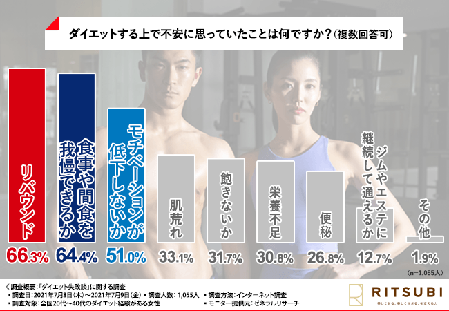 そこで、「ダイエットする上で不安に思っていたことは何ですか?(複数回答可)」と質問したところ、『リバウンド(66.3%)』と回答した方の割合が最も多く、次いで『食事や間食を我慢できるか(64.4%)』『モチベーションが低下しないか(51.0%)』『肌荒れ(33.1%)』『飽きないか(31.7%)』『栄養不足(30.8%)』『便秘(26.8%)』『ジムやエステに継続して通えるか(12.7%)』と続きました。