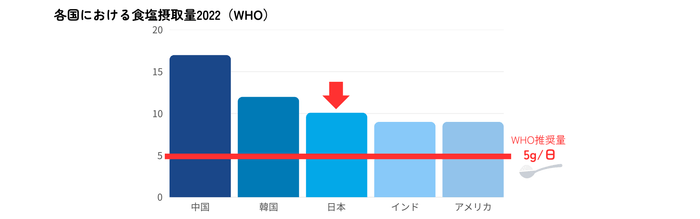 食塩は、過剰摂取により高血圧や心疾患、脳血管疾患のリスクを高め、食生活起因の死亡の約20%、年間1,100万人の要因と言われています。WHOは1日5g以上の食塩摂取でリスク上昇を警告しますが、世界平均は10.6gと推奨量の2倍以上。減塩が重要であるものの、食生活や嗜好から実際には難しいのが現状です。