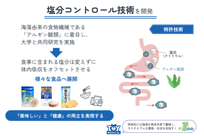 この塩分コントロール技術には海藻由来のアルギン類を使用しており、このアルギン類には塩分(ナトリウム)を吸着する働きがあります。舌で味を感じた後に吸着するため、おいしさを保ちながら塩分量を調整することができます。
