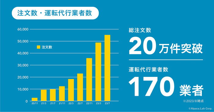 エアクルでは、利⽤者がスマホやタブレットから配⾞発注をすると、運転代⾏業者と利⽤者の位置情報を活⽤し、効率的なアルゴリズムにより最適な配車を⾏います。アプリによる配車は平均30秒、平均到着時間は9分となり、従来と比較すると約80%以上の時間短縮に成功し、今までにない配車体験と業務改善を実現しました。現在の利用者は90,000ダウンロード、累計注文数は20万件を突破。運転代行業者は170業者370台以上が登録されるまでに成長しました。