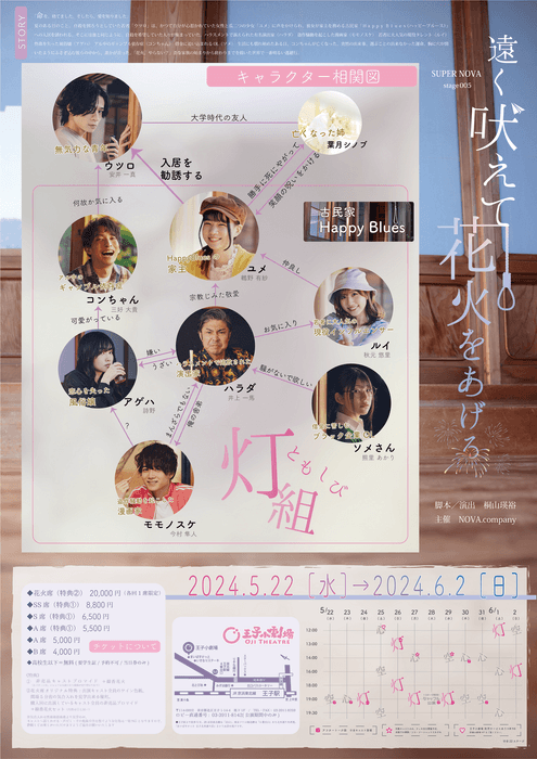 SUPERNOVA『遠く吠えて花火をあげる』が2024年5月22日 (水) 〜 2024年6月2日 (日)に王子小劇場(東京都北区王子 1丁目14-4 B1F)にて上演されます。この度、キャラクタービジュアルと相関図が解禁となりました。