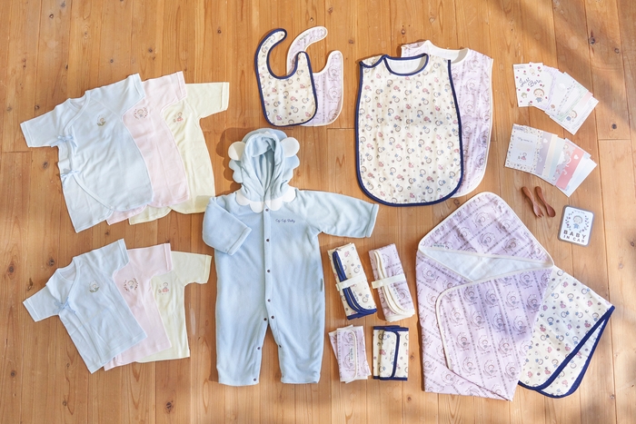 コンビ肌着(3種) 各2,750円 ガーゼスタイ(2種) 各1,980円 スリーパー(2種) 各4,180円 月齢カード(15枚入り) 1,320円 木製スプーン&フォーク 1,870円 セーフティサインステッカー 880円 おくるみ(2種) 各4,180円 おむつ替えシート(2種) 各3,850円 ガーゼよだれカバー(2種) 各2,200円 フリースロンパース 11,000円 短肌着(3種) 各2,200円