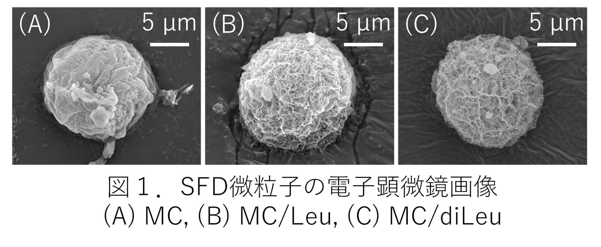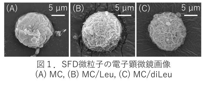 作成したSFD微粒子を電子顕微鏡で観察したところ、成分による大きな違いはみられず、すべてのSFD微粒子が10–20 µmの直径で中空多孔性に富む球状構造を有していました (図1)。