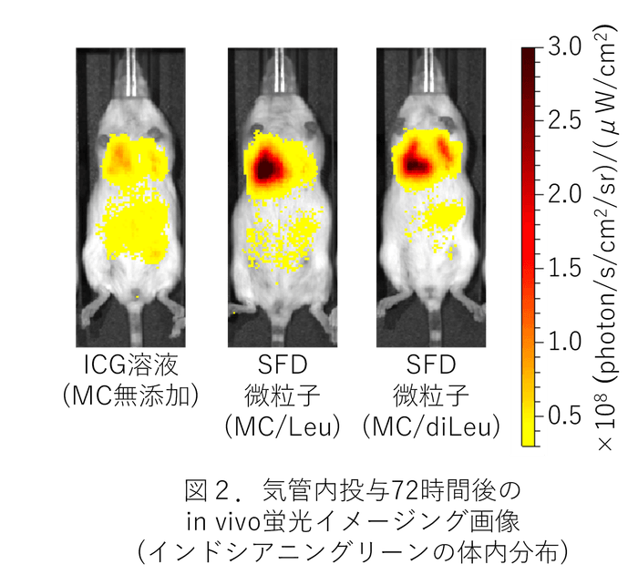 これらのSFD微粒子をマウスに気管内投与した後、モデル薬物として含有したインドシアニングリーン由来の近赤外蛍光をin vivo蛍光イメージング注3)により経時的に検出・解析した結果、MCを含む水溶液と同様にSFD微粒子でも、MCを含まないICG水溶液と比べて肺局所でより長時間にわたり強い蛍光が検出され、MC含有による肺内での薬物滞留性の向上効果が示唆されました (図2)。一方、肺障害性マーカーとして測定した体重・肺重量・動脈血酸素飽和度・気管支肺胞洗浄液注4)中の有核細胞数に変化はみられず、これらのSFD微粒子の高い安全性が窺えました。