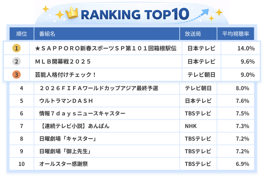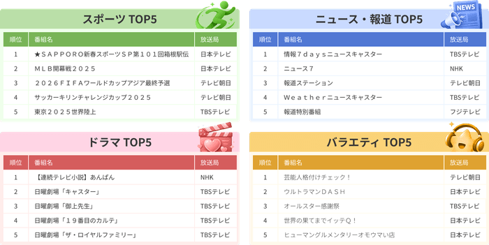 箱根駅伝やMLB開幕戦、FIFAワールドカップアジア最終予選、世界陸上などのライブスポーツに加え、夜のニュース・報道番組、正月特番や日曜劇場シリーズ、連続テレビ小説などの長期ドラマが上位に並び、「ライブスポーツ」「夜のニュース」「長期ドラマ・正月特番」が2025年のテレビ視聴を特徴づける結果となりました。