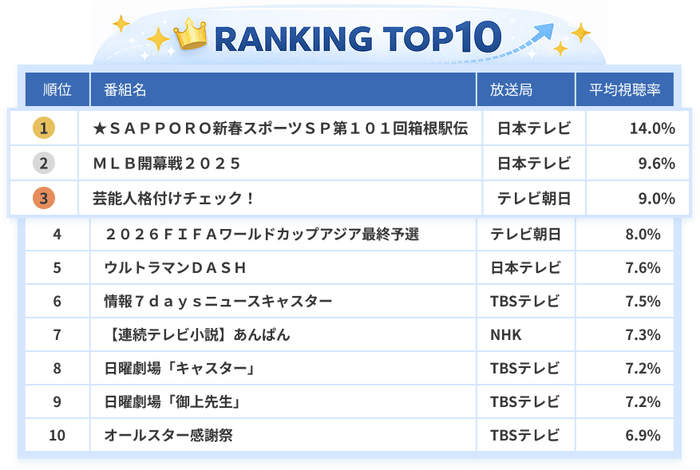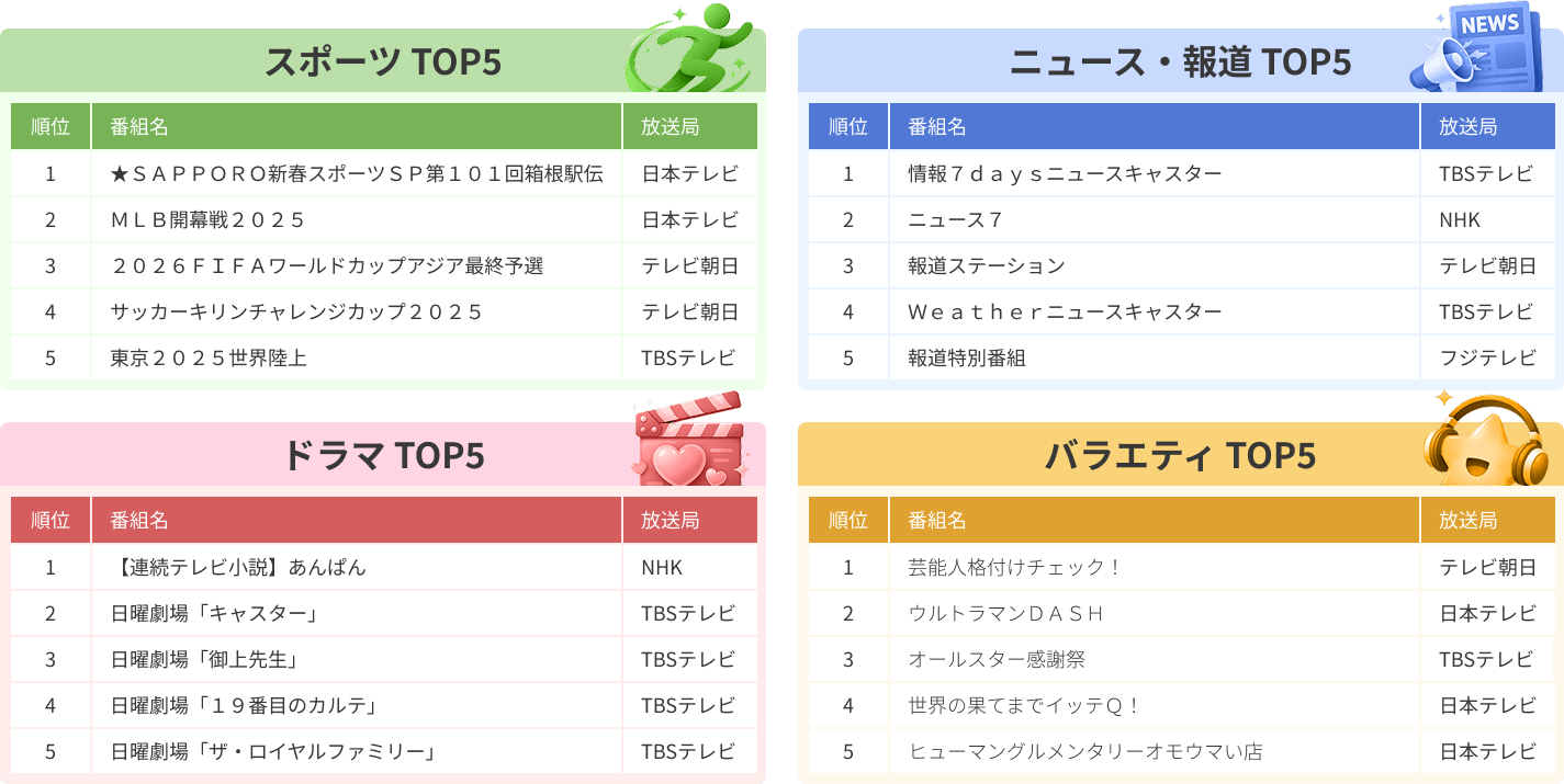 シリーズ別ランキングをカテゴリ別に見ると、スポーツは「箱根駅伝」や「MLB開幕戦2025」、ニュース・報道は「情報7daysニュースキャスター」や「ニュース7」、ドラマは「日曜劇場」や「連続テレビ小説」、バラエティは「芸能人格付けチェック!」「ウルトラマンDASH」「オールスター感謝祭」など、各ジャンルの定番番組が上位を占めました。