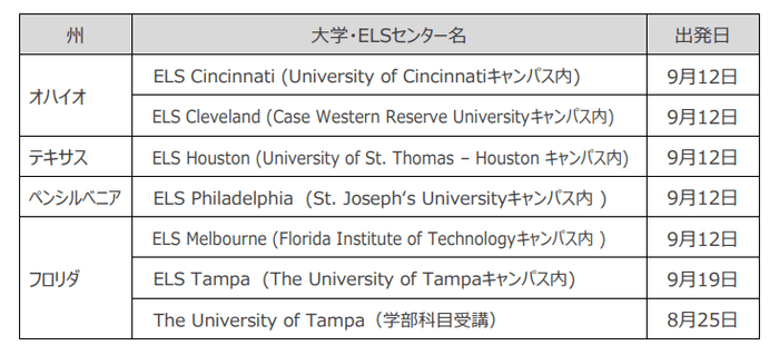 グローバル専攻の学生が留学する米国は、外務省が定める感染症危険レベルが現在も「3 渡航中止勧告」の状態ですが、近畿大学でのワクチン職域接種の実施と現地の受け入れ態勢が整ったことを受けて、派遣を決定しました。令和3年(2021年)8月25日のフロリダ州タンパ大学で学部科目受講する1人を皮切りに、9月12日にはオハイオ州、テキサス州、ペンシルべニア州、フロリダ州の5拠点へ118人が出発し、9月19日にはフロリダ州タンパ大学へ35人が出発します。