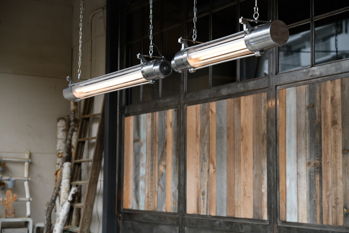 ヨーロッパでは1950年代頃から多くのインダストリアルな照明が作られました。当時の照明は、防爆・防塵・防水機能を兼ね備え、主に工場や発電所、公共の施設などで使われていました。今でもヨーロッパ各地の廃工場などに残っています。インダストリアルが持つ力強いデザインは、現在もカフェやレストラン、ショップなどのアクセントとして活躍しています。私たちは当時のデザインを再現しつつ、現代の技術でアレンジしたネオ・インダストリアルランプを作っています。