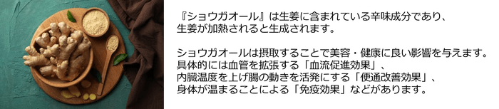 悩ましい“夏冷え”・“夏便秘”へ効果的な対策があります。それが『ショウガオール』の摂取です。『ショウガオール』とは、夏冷え対策に食べたい食材の1位にもなっている「生姜」を加熱することで生まれる成分の一つです。『ショウガオール』には、その腸管血流を促進する働き(内臓機能を活発にする働き)があり、身体の冷えを温める「冷え対策効果」、便通を改善する「便秘対策効果」を有しています。近頃健康習慣としてブームの“サウナ”にも同様の効果があり、『ショウガオール』は“摂るサウナ”であると言えます。