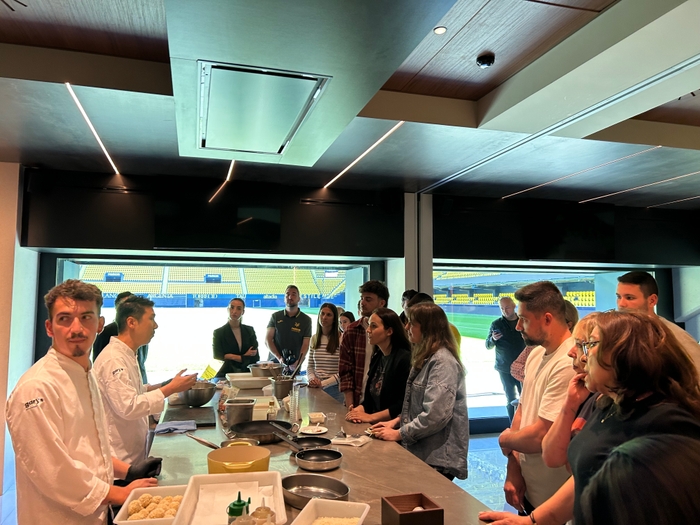 経緯として、同チームでは選手が世界中から集まっており、チーム内の食のダイバーシティが進み、昨今増加しているヴィーガンやハラル等に幅広く対応できる植物性たんぱく質の豆富の使用を検討はしていたとのことでした。しかしながら、チームのメディカルディレクターのウソ氏は、今までの欧州内の豆富の味に満足できず中々進められない状況にありました。今回当社の本格的な日本の豆富に出会い、これなら使用できるとの判断があり開催に至りました。