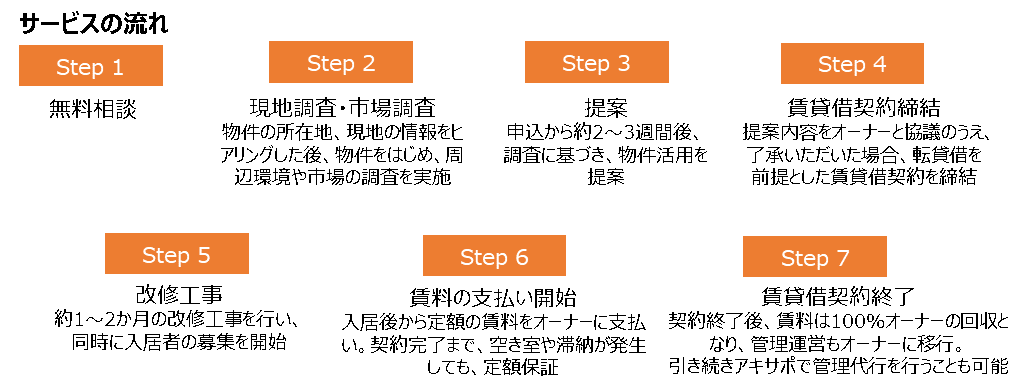 首都圏を中心に、空き家を「アキサポ」が借り受け、「アキサポ」全額費用負担でリノベーション工事を行い、