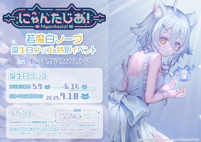 株式会社ClaN Entertainment(本社:東京都港区 代表取締役社⻑:⼤井 基⾏、以下ClaN)は、株式会社サンリオ(本社:東京都品川区)と共同で行うVTuberプロジェクト「にゃんたじあ!」に所属する「若魔白ソーダ」が5月10日に誕生日を迎えることを記念し、誕生日グッズの販売を行います。