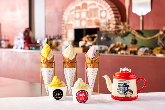 ミルキー風味のオリジナルジェラートと可愛いペコちゃんポットに入ったミルキーソースが登場。オリジナルジェラートにソースをかけてミルキー感を増すのもよし、紅芋や島豆腐の味にかけるのもよし。思い思いの楽しみ方ができちゃいます!