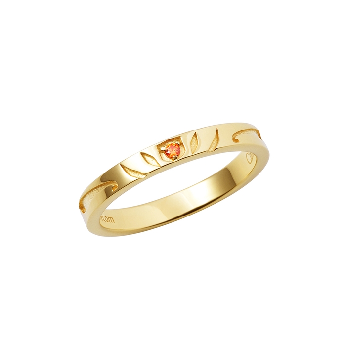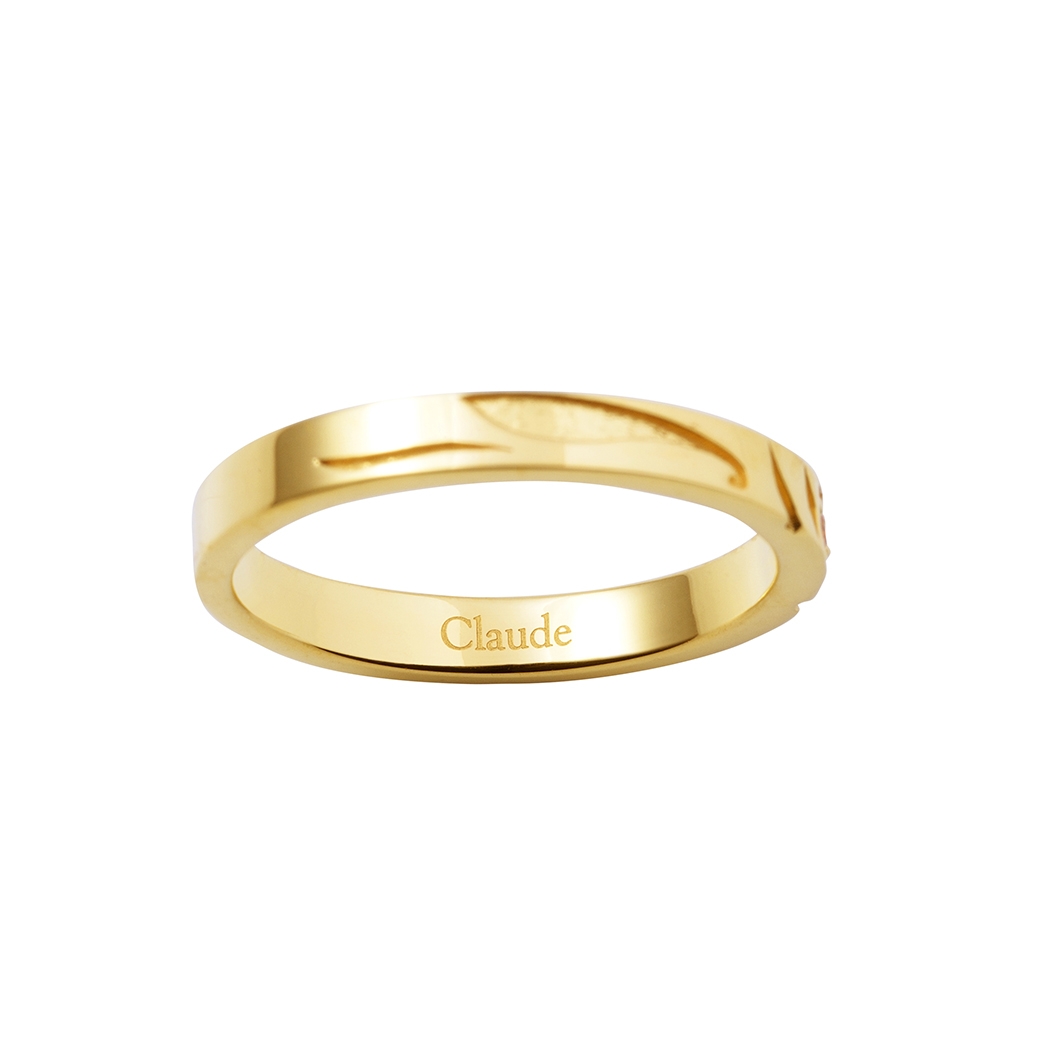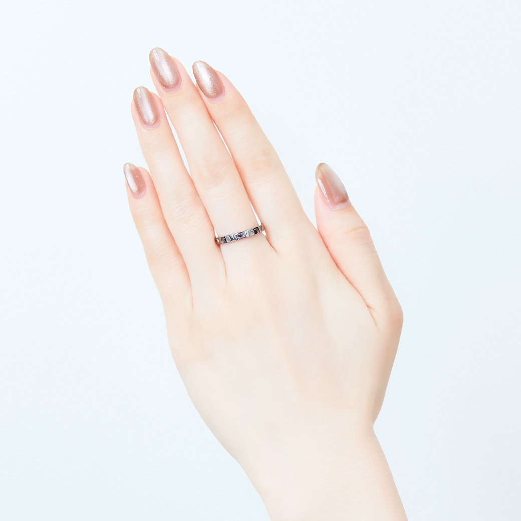 ストレートタイプのリングに陣営マークの柄を取り込み、イメージカラーストーンをセット。リング内側にはキャラクターの名前を英字で刻印しました。