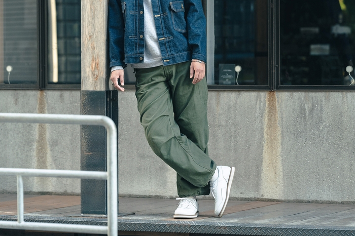 広めのつま先と一枚革のアッパーで歩きやすく、履き込むほど足に馴染む定番スニーカー。どんな服装にも合わせやすいモデル。