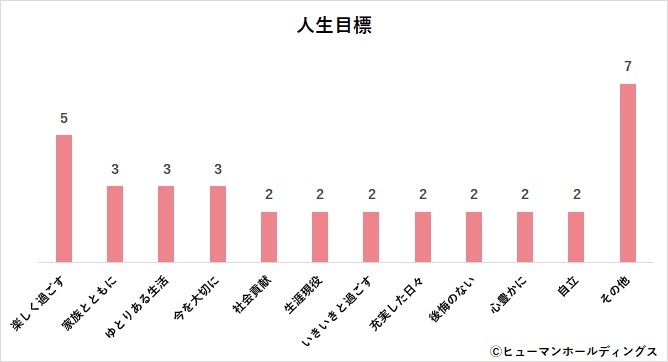 「人生目標」を達成するために必要な8大分野の各項目の中で一様の傾向があったのは「仕事」の項目で、13名が【現在の仕事の向上】系目標を設定しています。「現在の仕事内容においての理解を深めリーダーシップを高める」「リーダーシップ能力の向上」「一丸となるチーム作り」など、現在の仕事におけるマネジメント能力の向上を重視しているようです。