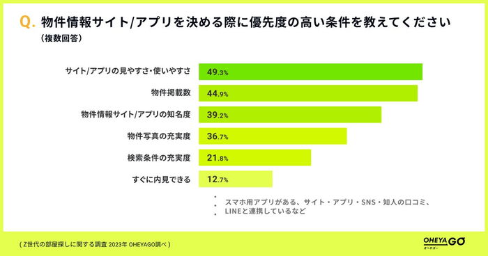また、物件情報サイト/アプリを決める際の優先度の高い条件は、約半数が「見やすさ・使いやすさ」と回答し、「物件掲載数」や「知名度」「物件写真の充実度」を上回りトップとなりました。