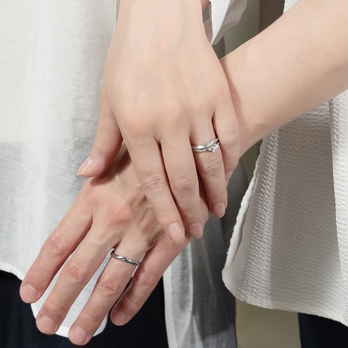 このほどの新作ブライダルリングは、“心地よく流れる時間を、大切なあなたとともに…”をコンセプトに、指のつけ根に馴染むやわらかな曲線美を表現しました。婚約指輪は、センターダイヤモンドに寄り添うように、2石のダイヤモンドをセッティングしています。結婚指輪は、3つの面があるウェーブラインのリングで、プレーン、メレダイヤモンド5ピース、17ピースなど留め方をアレンジできるデザインです。