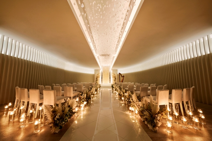 このたび15周年を迎えたゲストハウスウエディング会場「アプローズスクエア東京迎賓館」(所在地:東京都新宿区市谷仲之町3-5)では、チャペルをリニューアルし、円形のデザイナーズチャペルへと生まれ変わりました。左右の天井から降り注ぐ木洩れ日のような光が印象的で、幾重にもかさなった羽板デザインの壁の向こうから光が漏れる作りになっています。20mもの長さを誇る大理石のバージンロード、天井に輝く1,000個のクリスタル、祭壇のマザー・オブ・パール(貝殻)、そのすべてが光をきれいに反射する非日常空間で、一生の想い出に残る、最高のプロポーズを叶えていただけます。