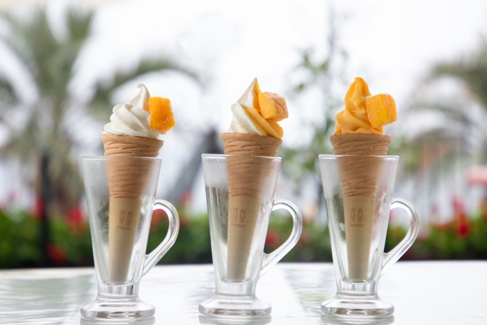 「ミエレ ザ ガーデン」では、夏に旬を迎えるトウモロコシをメインとした「焼きトウモロコシの冷製スープパスタ」を提供 いたします。焼きトウモロコシの甘みと香ばしさがクリームベースの冷製スープに溶け込んださっぱりとお楽しみいただける パスタです。その他、ミエレ ザ ガーデンで大人気の季節の果物を使用したソフトクリームも夏季限定バージョンで登場!今夏は濃厚な風味でフルーティーな味わいのマンゴーを使用した「マンゴーソフト」を3種ご用意。暑い夏に食べたくなる、甘くてひんやりとしたマンゴーソフトで今年の夏をお愉しみください。