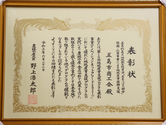 五島の椿プロジェクト認定パートナーである、五島の椿株式会社(本社:長崎県五島市、代表取締 役社長:谷川富隆)と五島市商工会によって推進されている「五島つばき酵母」を軸とした一連の取り組みが、イノベーションネットアワード2021において、五島市商工会が主体として、農林水産大臣賞を受賞されましたことをお知らせいたします。