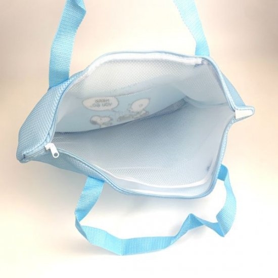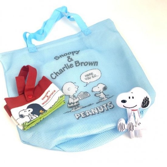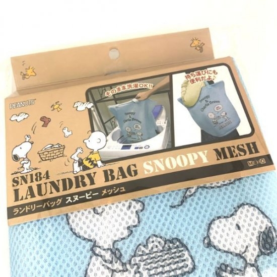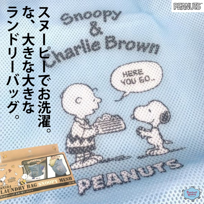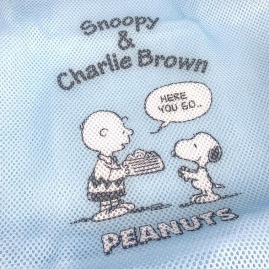 厚めのメッシュ素材で作られたランドリーバッグ。裏表メッシュ素材です♪この時期にピッタリの青空のような青色は気分も爽やかにしてくれそう!真ん中のチャーリーブラウンとスヌーピーがポイントです。