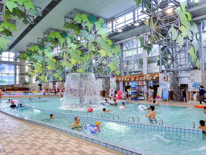 南国ムードの空間には、流れるプールや泡のプール、キッズプールなどバラエティ豊かなプールが勢ぞろい。