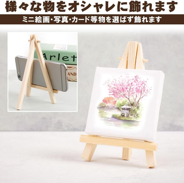 ミニキャンバスに描いた絵をはじめ、写真・ポストカード・CDなど飾るものを選びません。程よい傾斜があるためスマホスタンドとしても◎両手を離した状態で動画を観たりテレビ電話も可能です。アイディア次第で使い方の幅が広がるミニイーゼルは、ちょっとしたギフトやまとめ買いにいかがでしょうか?
