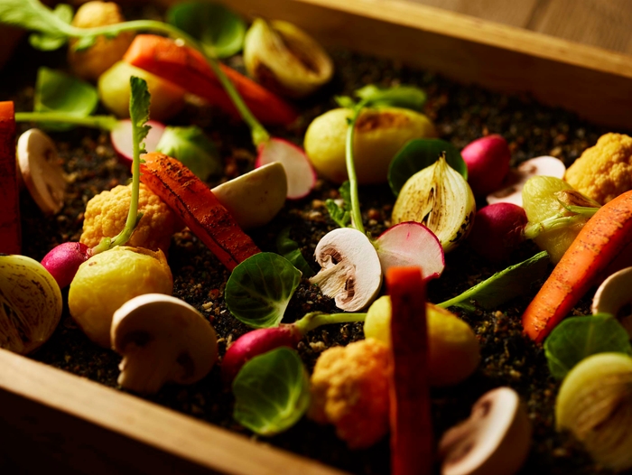 前菜のおすすめは収穫祭をイメージした“彩り野菜の菜園風”。土に見立てたマッシュポテトから野菜をすくってお召し上がりいただくこのメニューは、まるで自分で収穫をしているような感覚をご体験いただけます。チーズ、バジル、アンチョビをベースにした3種類のディップソースもご用意。取り分ける瞬間からわくわくする、遊び心たっぷりのメニューです。