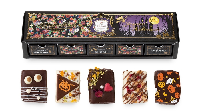 小箱が並んだパッケージが珍しく、抽斗型になっています。小箱の中にも魔法の杖や魔女の帽子など、ハロウィンモチーフの絵柄が入っており、お菓子を食べたあとも楽しめるようなデザインです。