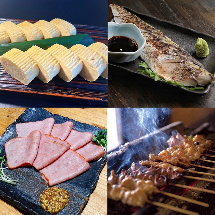 「京料理・寿司 松廣」の仕出し弁当やだし巻き玉子、「時代屋」の炭火焼き鳥の他、伏見グルメとして、炙り〆鯖、「いがや」の扇形ソーセージ、しいたけの炙り焼きやエイヒレ等、バリエーション豊富に提供いたします。ぜひこの機会に伏見の日本酒と共にお楽しみください。