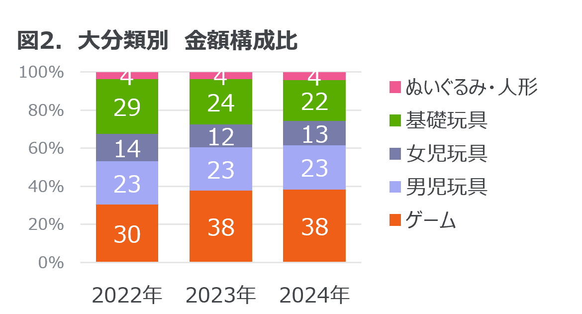 大分類別にみると、5つのうち4つの大分類が二桁成長となった。特に、金額構成比(図2)の4割弱を占める「ゲーム」の金額の伸びが最も大きく、市場拡大に貢献した。その中でもトレーディングカードゲーム(以下、TCG)は、前年よりも成長率は鈍化したものの、24年も前年に引き続き金額を伸ばした。「ポケットモンスター」が大きな金額を占めるTCG市場において、「ワンピース」が金額を大きく伸ばし、存在感の高まりが感じられた。