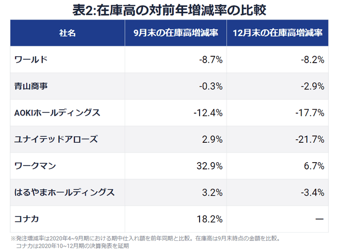 在庫高の2020年12月末の対前年増減率を9月末のそれと比較したのが表2だ。12月末時点の在庫高の減少度合いは、9月末時点のそれよりも総じて大きいことが分かる。唯一、在庫が増えているワークマンも、増加率は32.9%から6.7%へと大きく低下している。