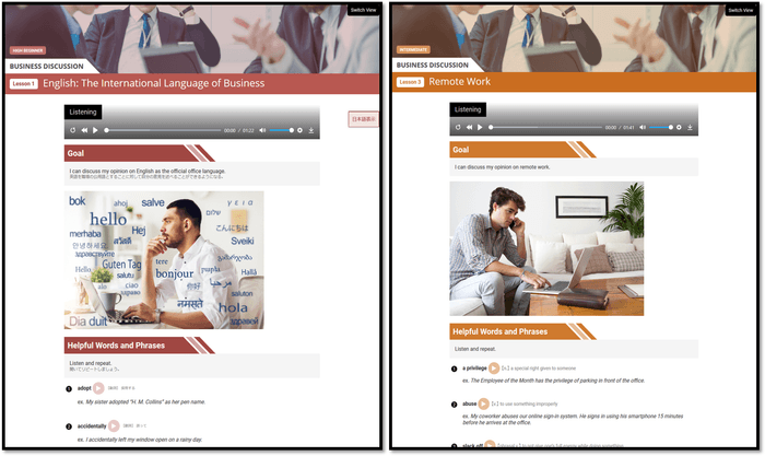 初中級者・中級者の方が対象で、ビジネスシーンでよく話題にあがるトピックについて、自分の意見とその理由を論理的に話せるようになります。残業、ドレスコードなど身近なトピックから、ワークライフバランス、能力給など、ビジネスシーンでは切っても切り離せないトピックについてディスカッションができるようになります。