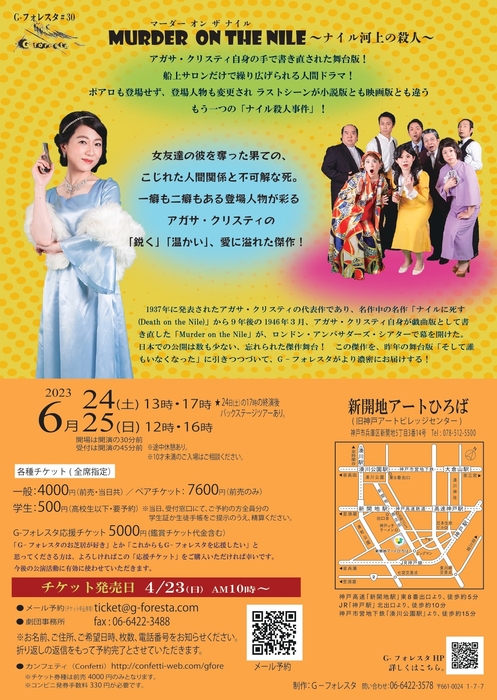 G-フォレスタ(代表:丸尾 拓)主催、『Murder on the Nile ~ナイル河上の殺人~』が2023年6月24日 (土) ~2023年6月25日 (日)に新開地アートひろば(兵庫県神戸市兵庫区新開地5丁目3番14号)にて上演されます。