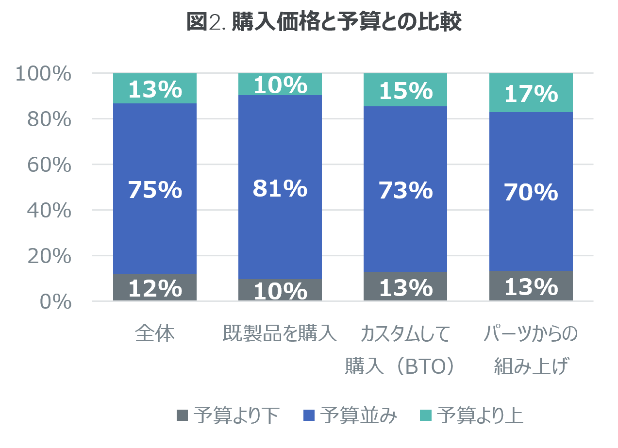 購入価格(パーツから組み上げた場合はその総額)と予算との比較では、ユーザー全体の75%が予算並みで購入しているものの、BTOのゲーミングパソコンやパーツからの組み上げは、予算より上での購入になった割合が全体より高かった(図2)。求めるスペックを実現するためパーツをカスタマイズしている分、高額になったとみられる。特にBTOパソコンは購入価格が高く、20万円以上での購入が半数を占めた。