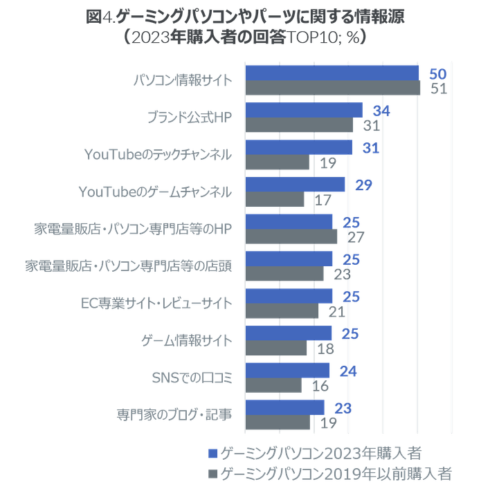 ・ゲーミングパソコンやパーツに関する情報を得る場所として、YouTubeの利用が4年前から大幅に増加した。