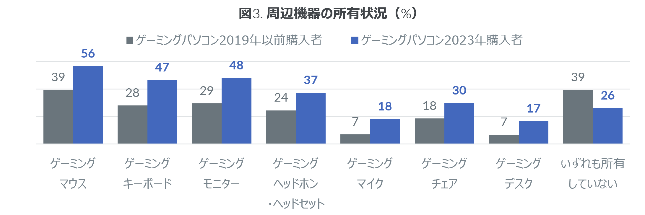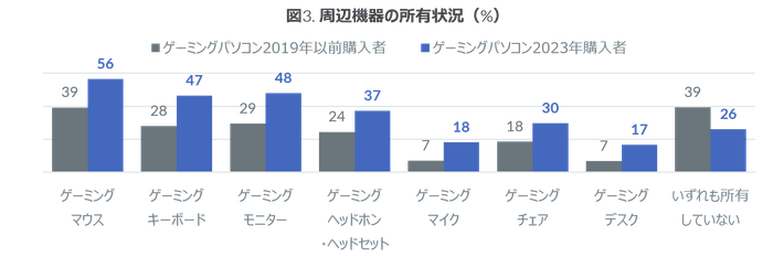 ・ユーザーの半数近くがゲーミングマウス、モニター、キーボードなどの周辺機器を所有している。