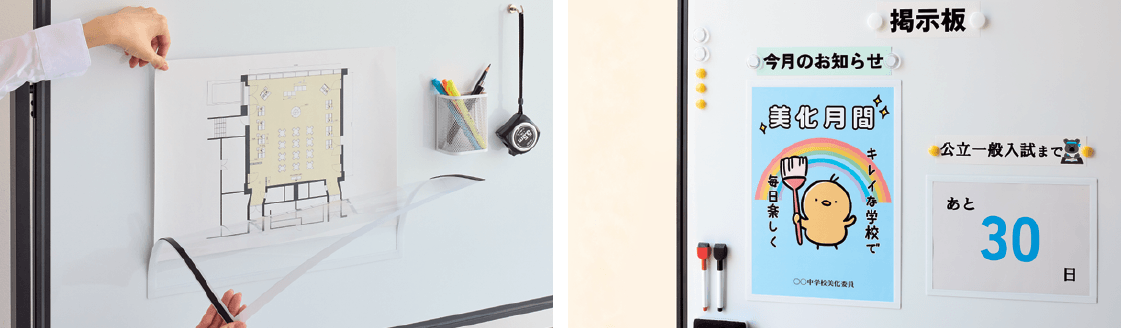 3辺にマグネットがついているため、縦向き・横向きどちらでも掲示可能。