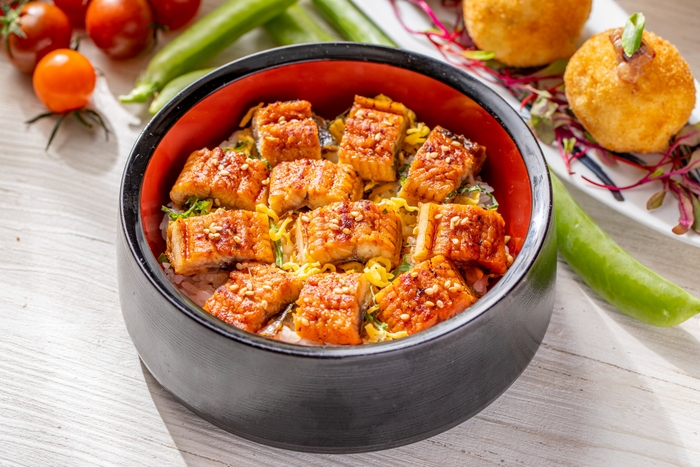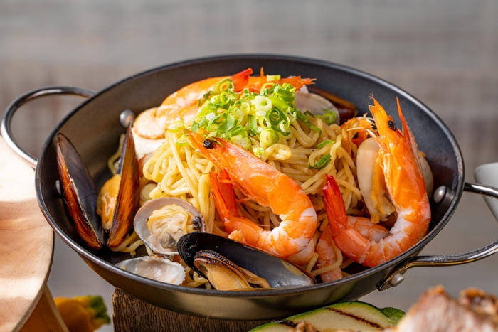 夏のスタミナ食”鰻のひつまぶし”や、つい食べたくなる”旨辛ガーリックシュリンプ”、シェフ特製の”鯵なめろうコロッケ”、優しい香りの”甘酒と梨の冷製スープ”、爽やかな口当たりの”夏野菜と手作り豆腐 根府川柑橘ジュレ”など夏にぴったりのお料理の数々がビュッフェ台にずらりと並びます。カレーステーションにはビーフ、チキン、シーフードの3種のカレーと、バターライスやターメリックライス、ナンもご用意しております。ライブコーナーでは、ホタテや海老、アサリ、ムール貝など魚介の旨味たっぷりの”海鮮こくうま焼きそば”の香ばしさが食欲をそそります。