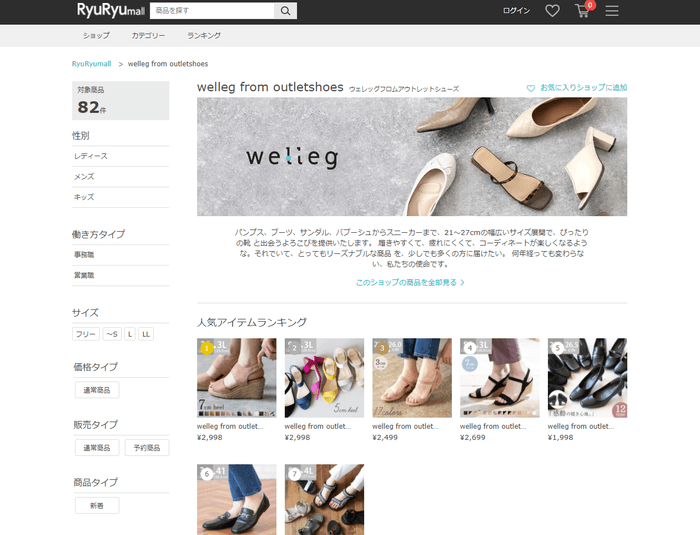 RyuRyumallは「大きいサイズ」の取り扱いに力を入れており、21~27cmと幅広いサイズ展開が魅力のwellegでも、ぴったりの靴と出会う喜びを提供します。