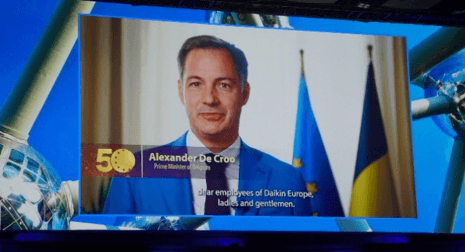 ダイキン工業株式会社の欧州子会社であるダイキンヨーロッパ社(Daikin Europe N.V.、本社:ベルギー王国オステンド市)は、創業50周年に伴い、現地時間10月12日にDe Bijloke (デ・ベイローク) ミュージックセンター (同国ゲント市) にて記念式典を開催しました。式典には、アレクサンダー・ドゥ=クロー ベルギー王国首相からビデオメッセージが寄せられたほか、正木 靖 欧州連合日本政府代表部特命全権大使や、三上 正裕 駐ベルギー特命全権大使の、地元政財界の方々など総勢600名以上が出席しました。