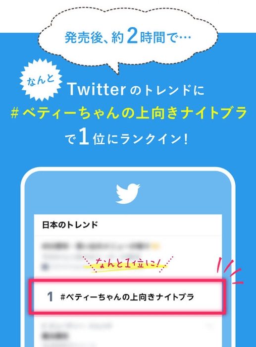 発売と同時にTwitterやInstagramなどSNSで話題となり、Twitterの日本のトレンドにて「#ベティーちゃんの上向きナイトブラ」が1位を獲得しました!