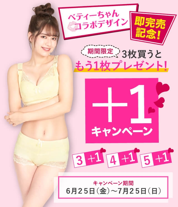 皆様とベティーちゃんのおかげさまで、発売後すぐに、ベティーちゃんエレアリーナイトブラが完売しました。株式会社イッティ(https://www.itty.co.jp/)は、それを記念してエレアリーナイトブラを3枚以上買うと1枚無料でもらえちゃう『+1キャンペーン』を開催いたします。ぜひこの機会にエレアリーナイトブラの機能性とデザイン性を実感してください。