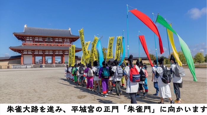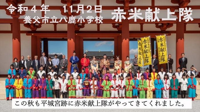 例年、地元・八鹿小学校の児童たちが田植えや稲刈りなどの体験活動をおこない、その締めくくりとして平城宮跡を訪れ、収穫した赤米を平城宮跡に届けてくれています。