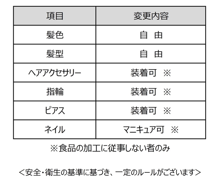 「清潔かつ衛生的であり、お客様に不快感を与えないこと」、「安全性と作業性を考慮し、業務に支障がないこと」を原則とし、髪色・髪型・アクセサリー等のルールを緩和いたしました。