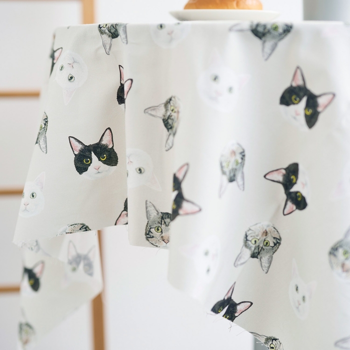 白猫の神秘的な佇まい、ハチワレの縁起の良さ、キジトラの親しみやすさ。それぞれの個性を丁寧に描き分け、猫好きの方はもちろん、日常にそっと寄り添うテキスタイルとして幅広くお使いいただけます。