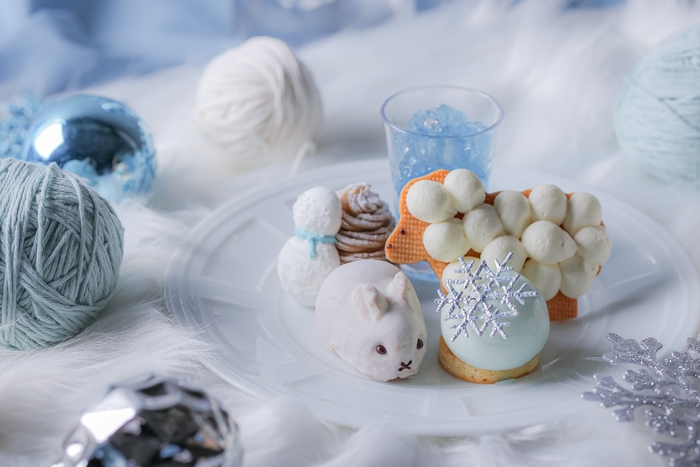 【スイーツ】ひつじのマシュマロクッキー/うさぎのマドレーヌ/白ワインジュレ/雪だるまモンブラン/マスカルポーネのムース/ワッフル ココナッツソース