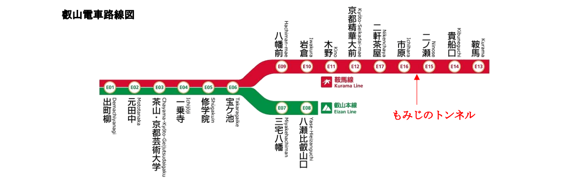 2.実施区間 鞍馬線 市原駅~二ノ瀬駅間にある「もみじのトンネル」区間(約250m)