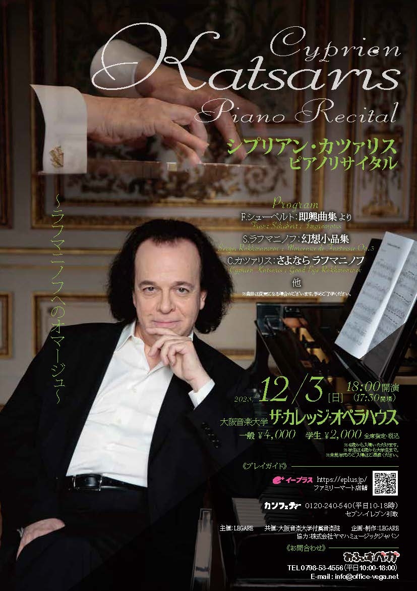 LEGARE主催、『シプリアン・カツァリス ピアノリサイタル ~ラフマニノフへのオマージュ~』が2023年12月3日 (日)に大阪音楽大学ザ・カレッジ・オペラハウス(大阪府豊中市庄内幸町1-1-8)にて上演されます。